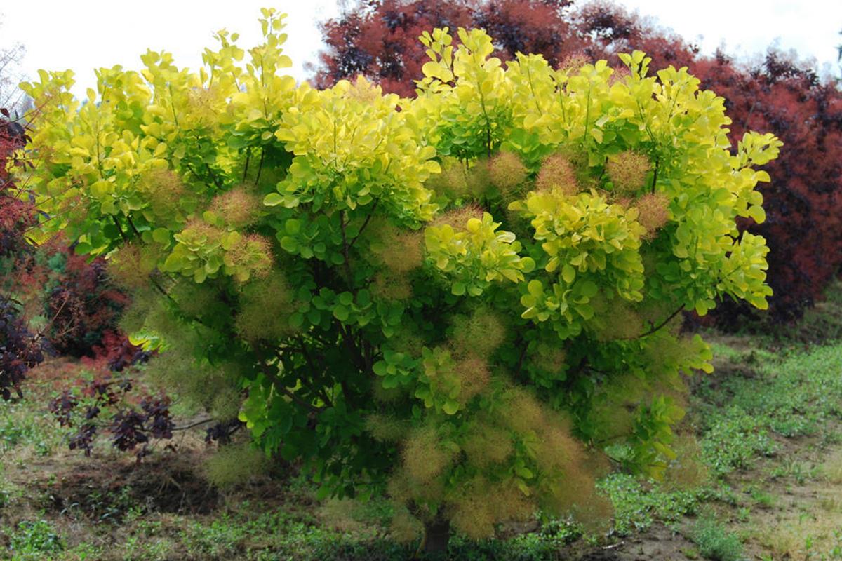 Цветение скумпии Голден Спирит происходит в начале лета, когда кустарник покрывается воздушными метелками мелких цветов, напоминающими дымку. Эти соцветия придают растению дополнительную декоративность и изящество.